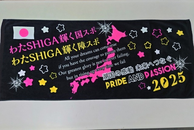 2025年開催 わたSHIGA輝く国スポ障スポ記念グッズ ★約34×85cm ★綿100% ★日本製 ★シャーリング・染料プリント 日本製タオルなので質感が滑らかです また染料プリントなので色落ちが少ないのも特筆!